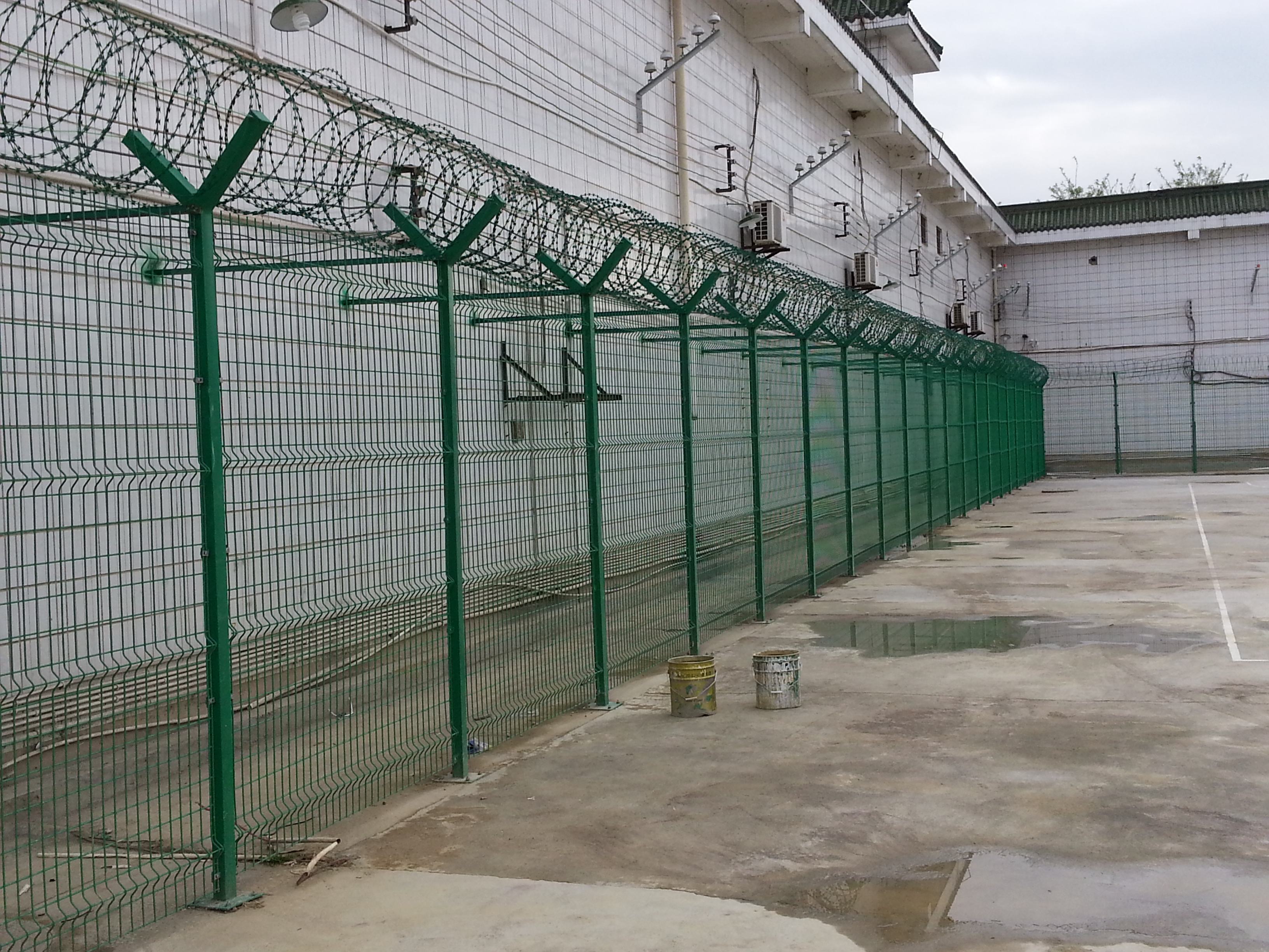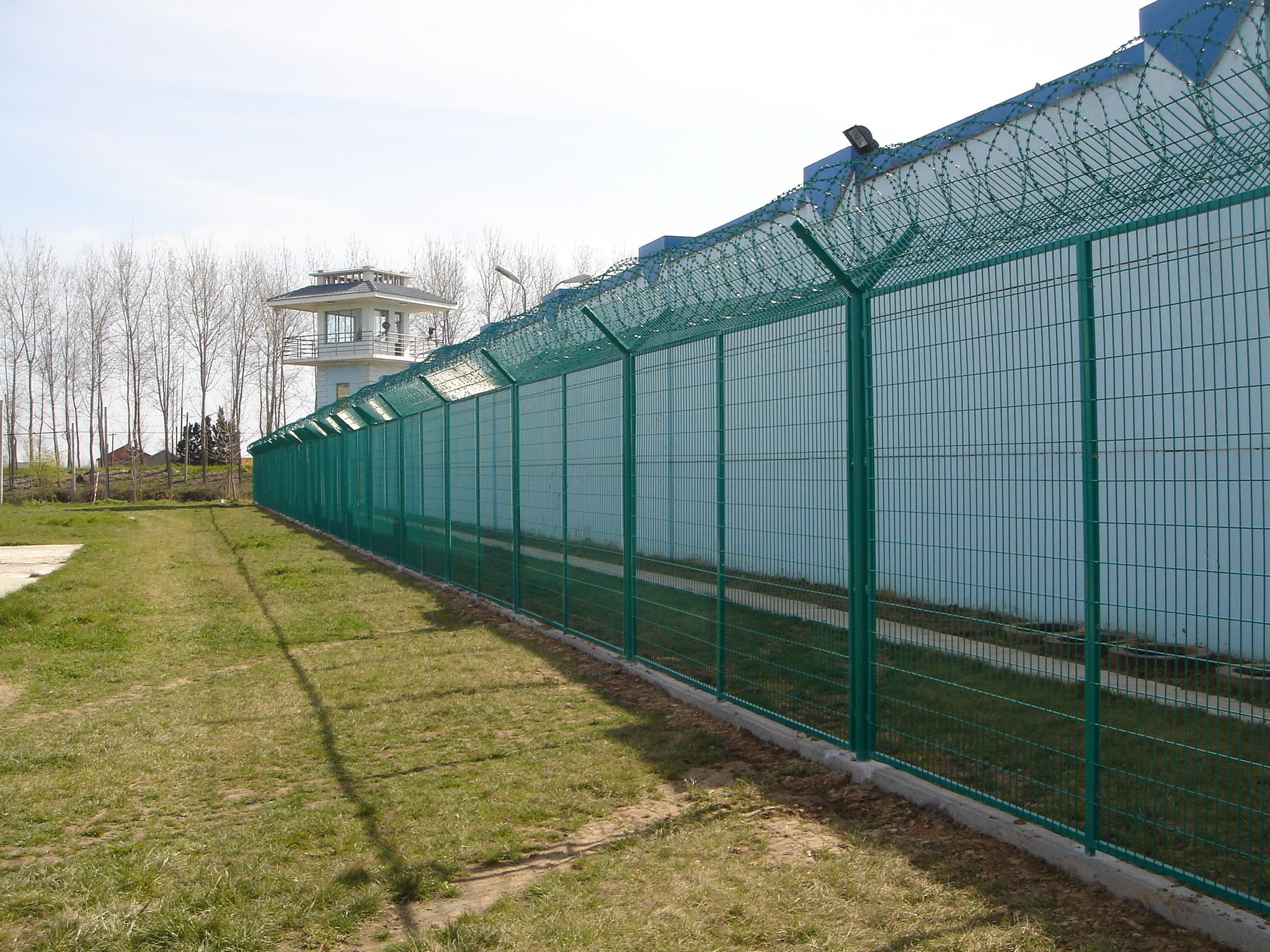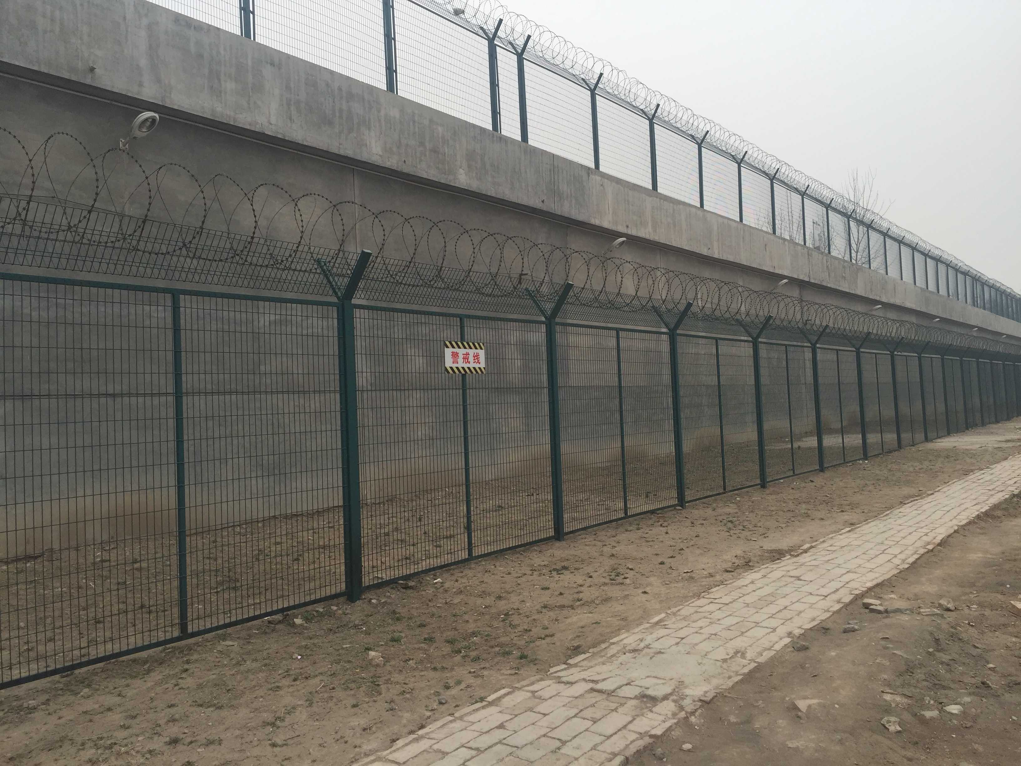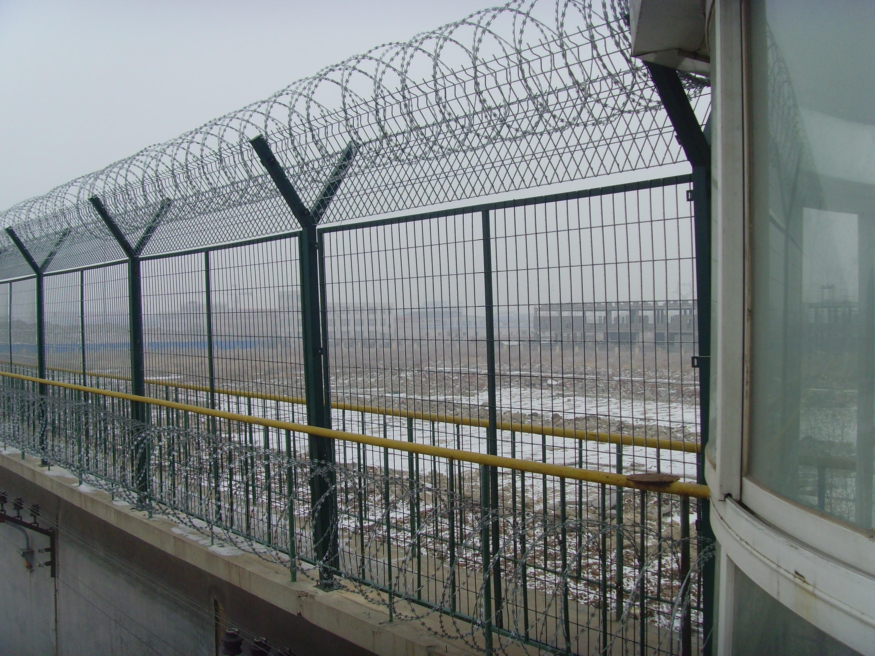 監獄鋼絲焊接的網片采用低碳鋼絲焊接而成,表面采用pvc浸塑處理,與刀刺網連接。安裝刀刺網的立柱采用6CM*6CM方管,壁厚在2-2.5MM,高2.4米,底部2米圍直線,上部0.4米向內折30度成斜線,立柱間隔為3米;橫梁采用4CM*2CM長方鋼,長3米為一個單位:立柱和橫梁表面涂黑綠色(注塑工藝),橫梁和立柱配有連接件。